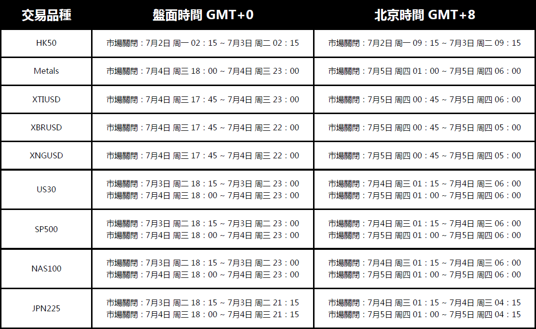 即将到来的香港回归日和美国独立日休市,以下品种交易时间将发生变化,具体请查阅表格相关信息。